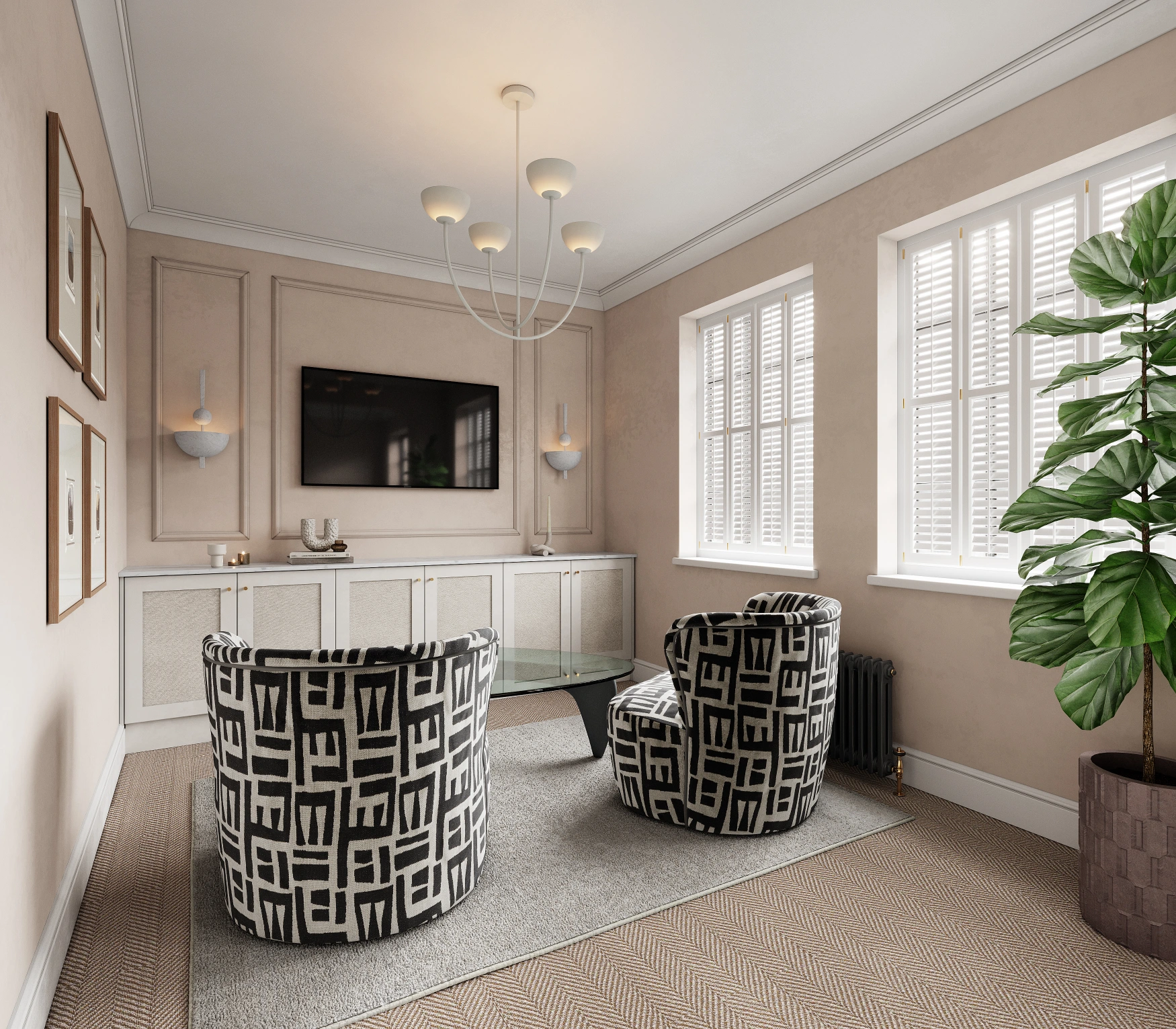 A bespoke motorised rooflight serves as a striking centrepiece, leading to a stunning roof terrace accessed via a custom-designed perforated steel spiral staircase. This feature, which meets stringent regulations while offering a sculptural aesthetic, reflects the botanical influences woven throughout the interior design scheme.