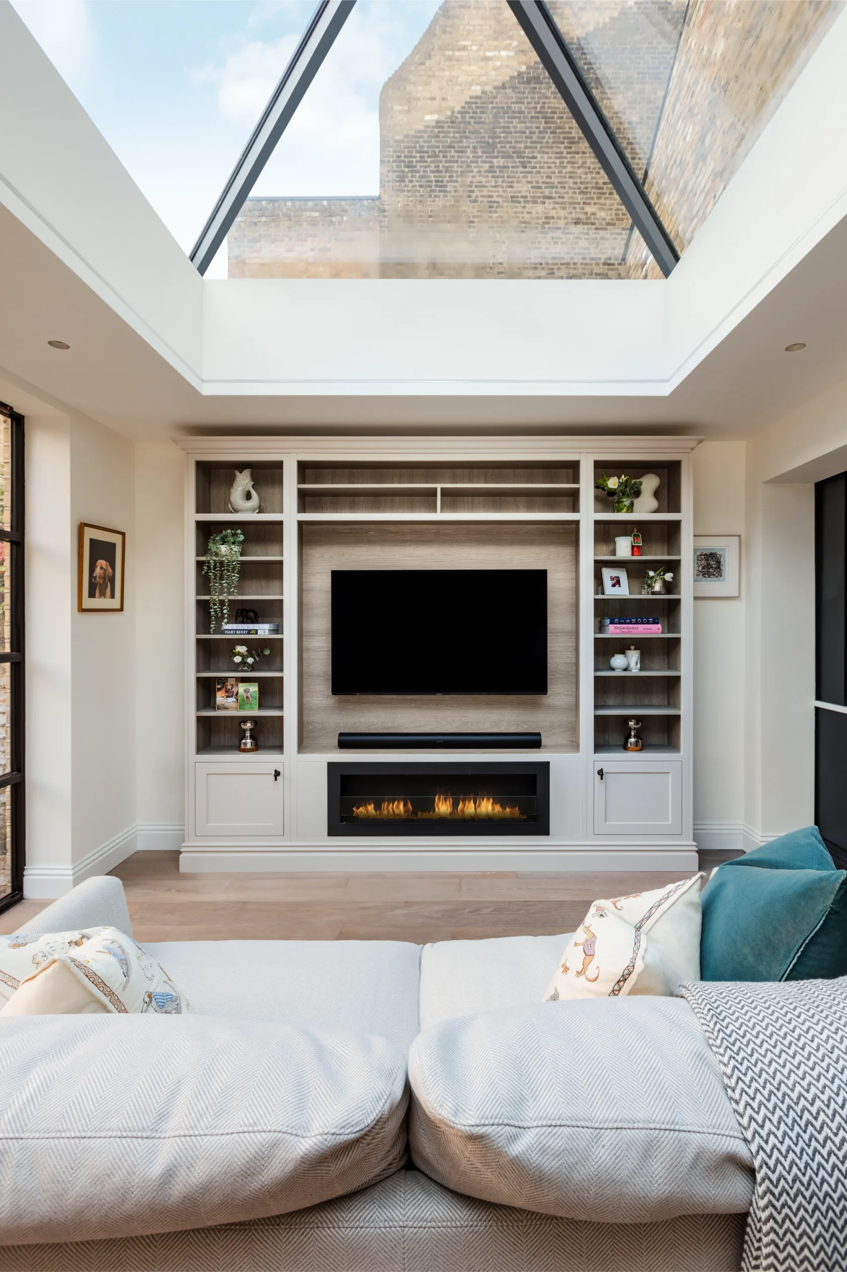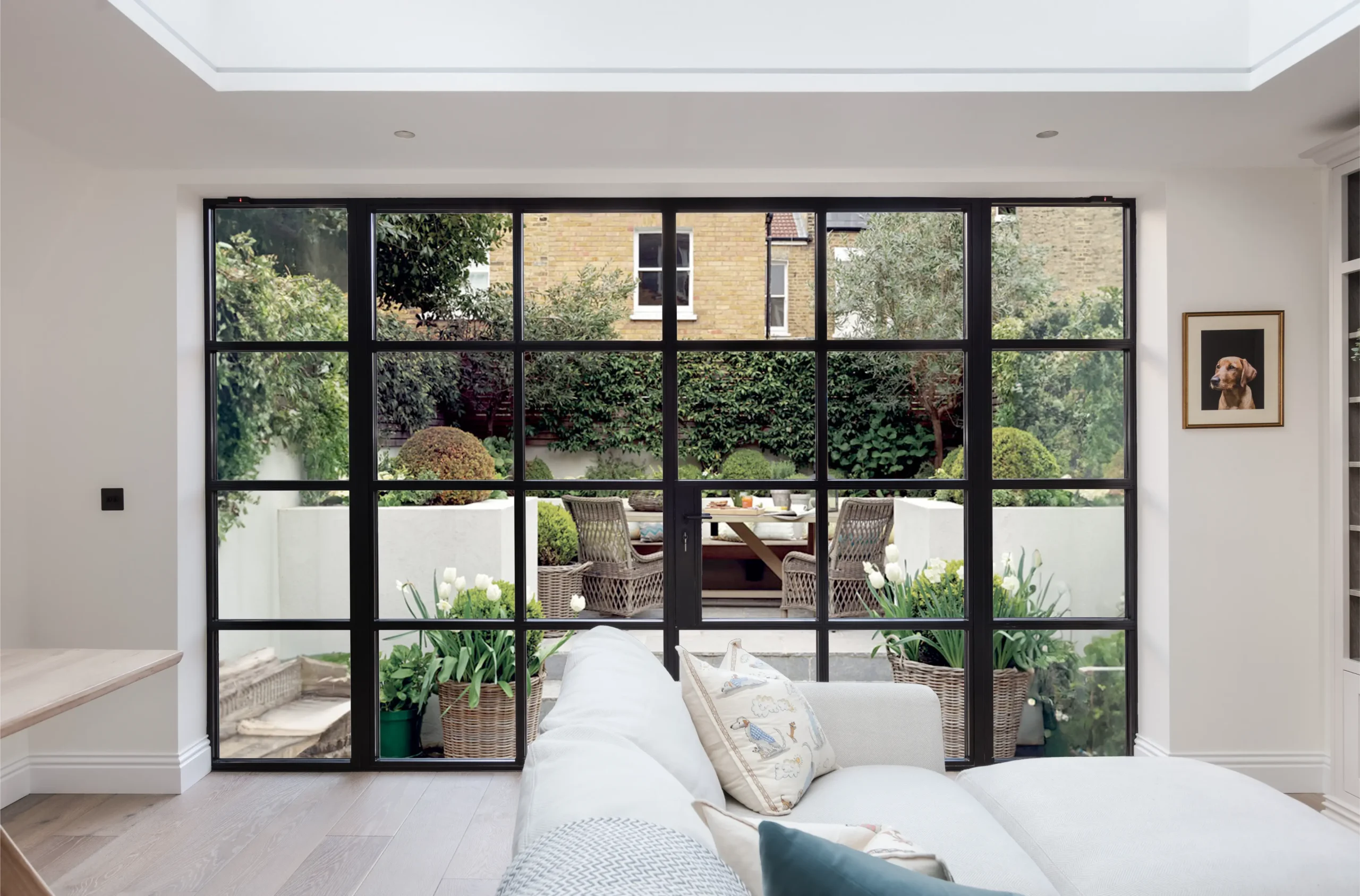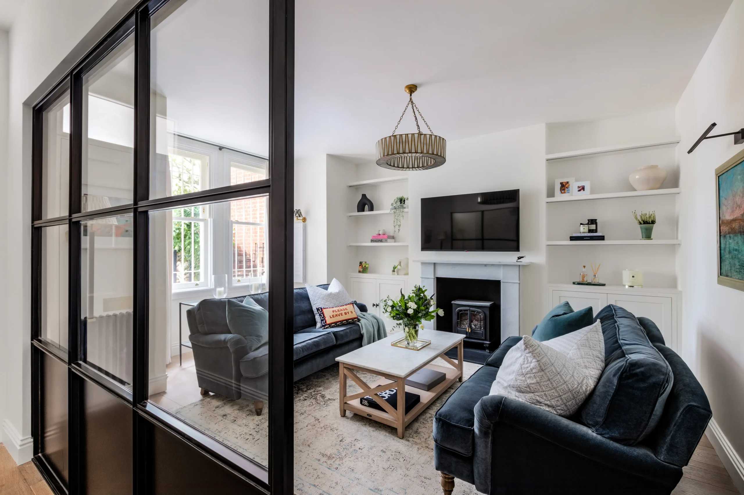A thoughtfully designed rear extension, featuring a striking roof lantern and heritage steel doors, floods the kitchen and living areas with natural light, creating a seamless connection to the beautifully landscaped garden. The open-plan layout was tailored to accommodate family life, with distinct zones for cooking, dining, and relaxation.