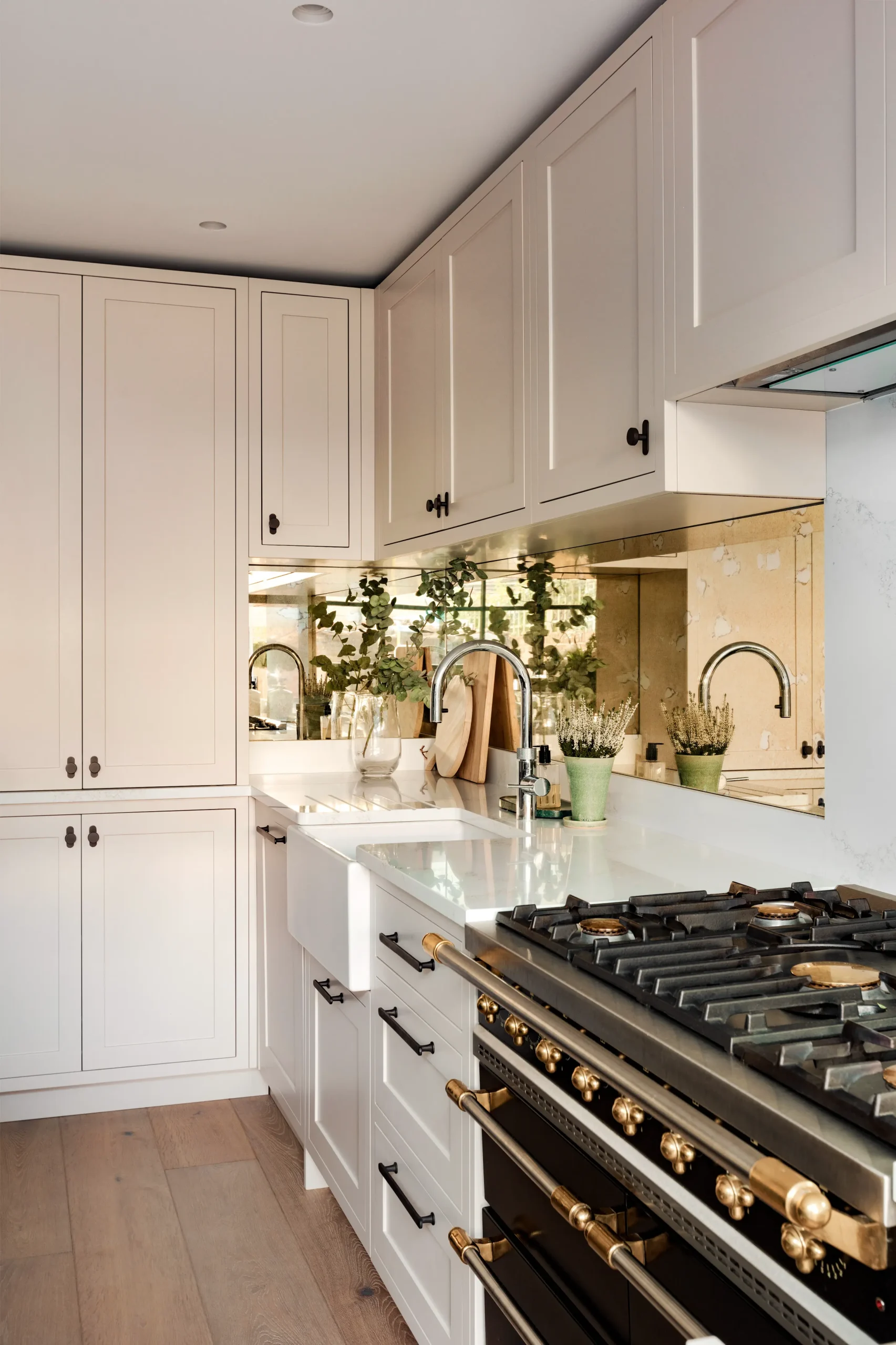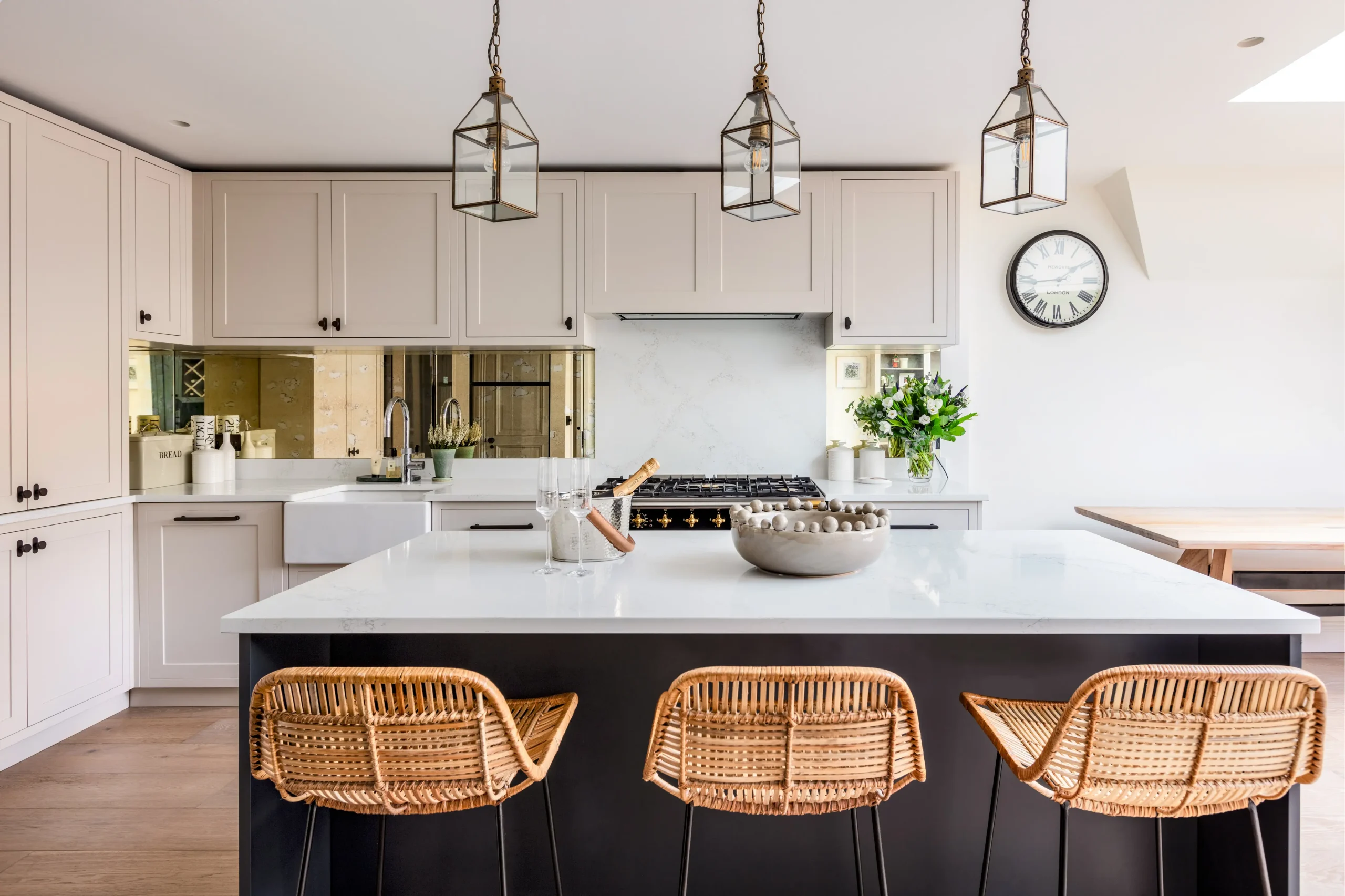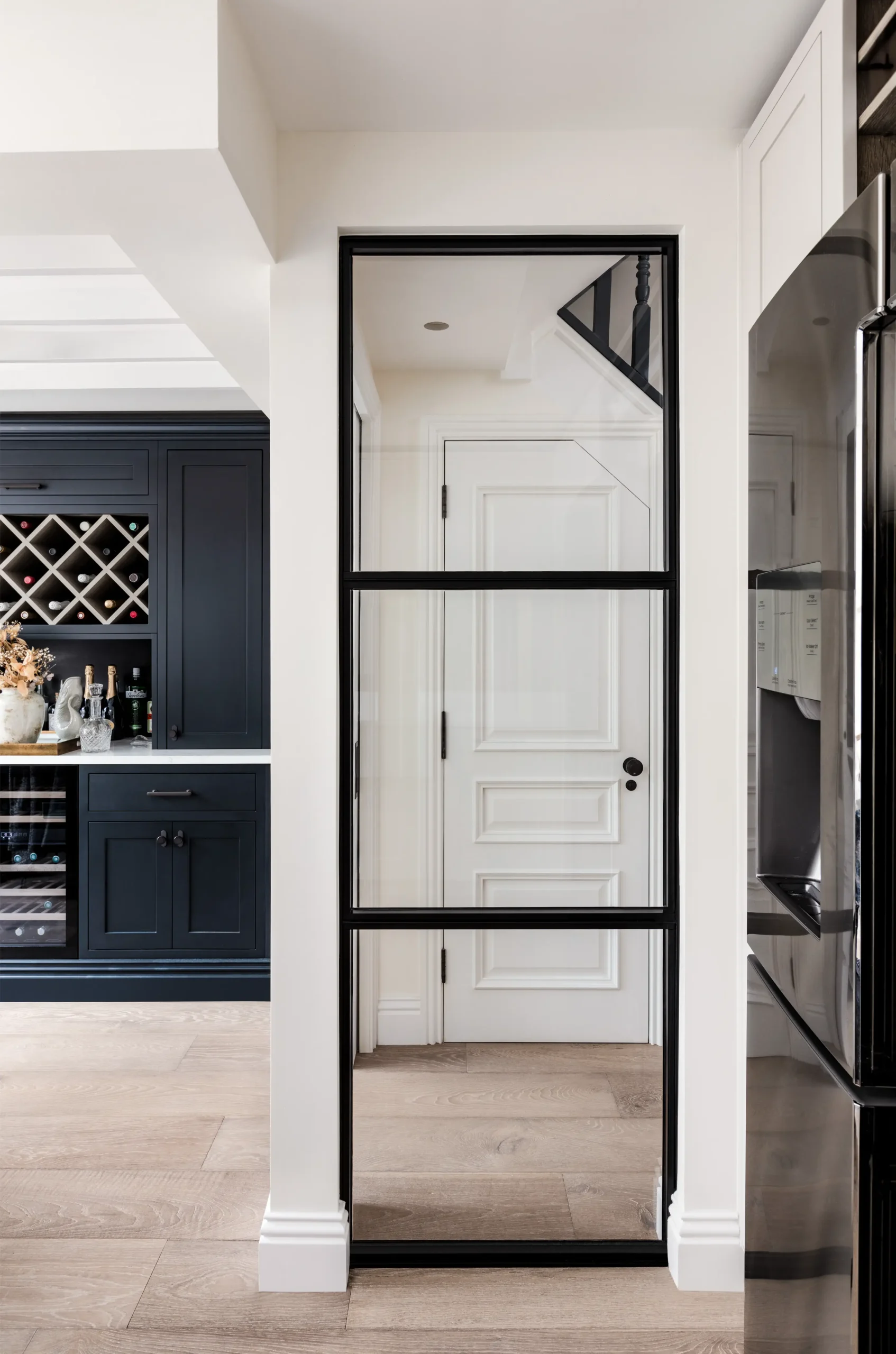 A thoughtfully designed rear extension, featuring a striking roof lantern and heritage steel doors, floods the kitchen and living areas with natural light, creating a seamless connection to the beautifully landscaped garden. The open-plan layout was tailored to accommodate family life, with distinct zones for cooking, dining, and relaxation.