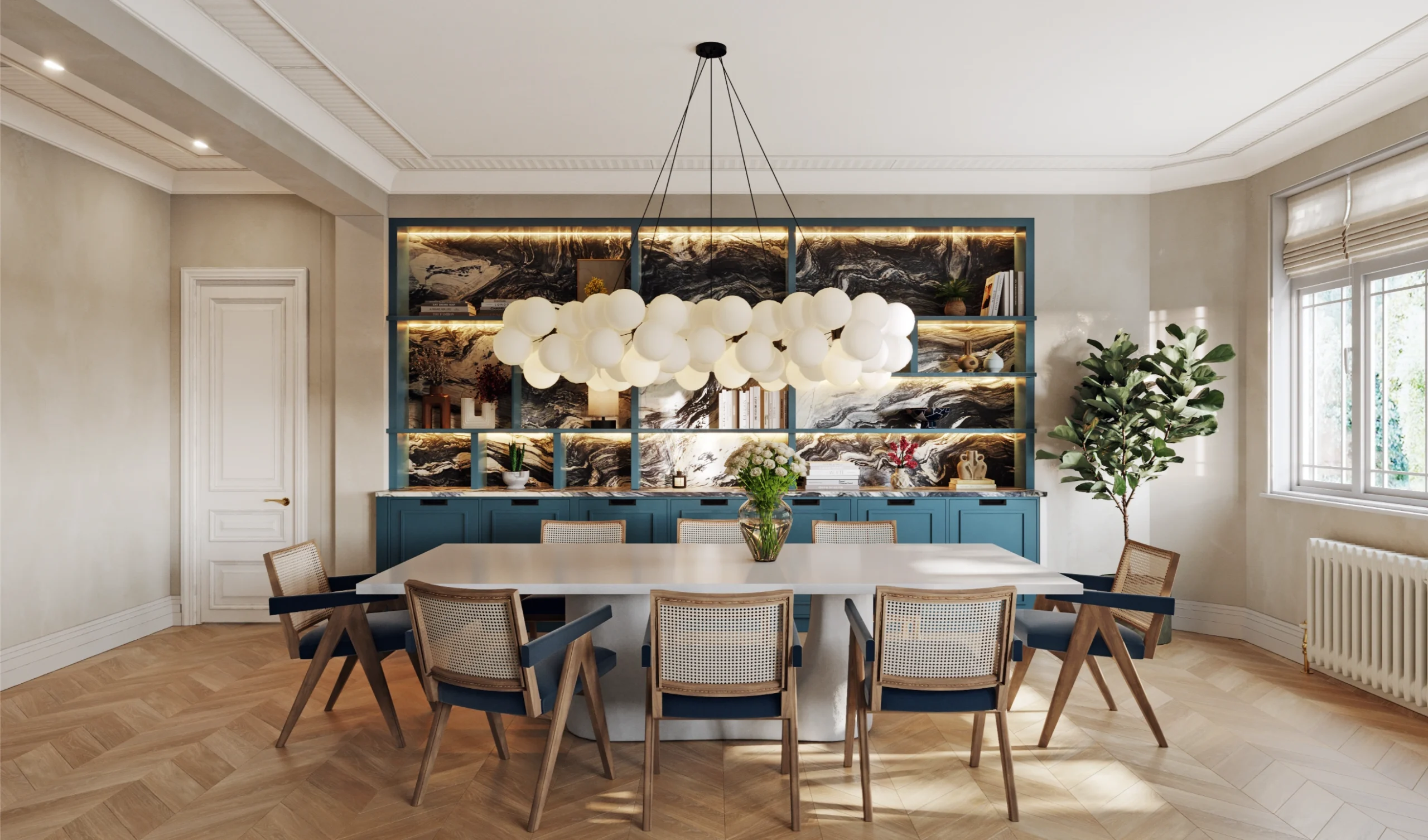 Luxurious materials, including a custom-designed marble dining table and natural stone finishes, elevate the interiors, creating a sense of refined sophistication. The highlight of the renovation is the opulent principal bathroom, featuring a striking backlit onyx design that exudes glamour. A full turnkey interior design package was provided, ensuring a seamless transition for the homeowners. The result is a residence that embodies timeless elegance, impeccable craftsmanship, and effortless liveability.
