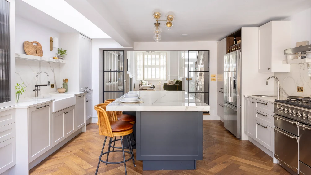 The newly designed open-plan kitchen and living space now extends from front to back, creating a seamless and airy environment. Heritage steel screens and bifold doors introduce light while maintaining a sense of architectural continuity.