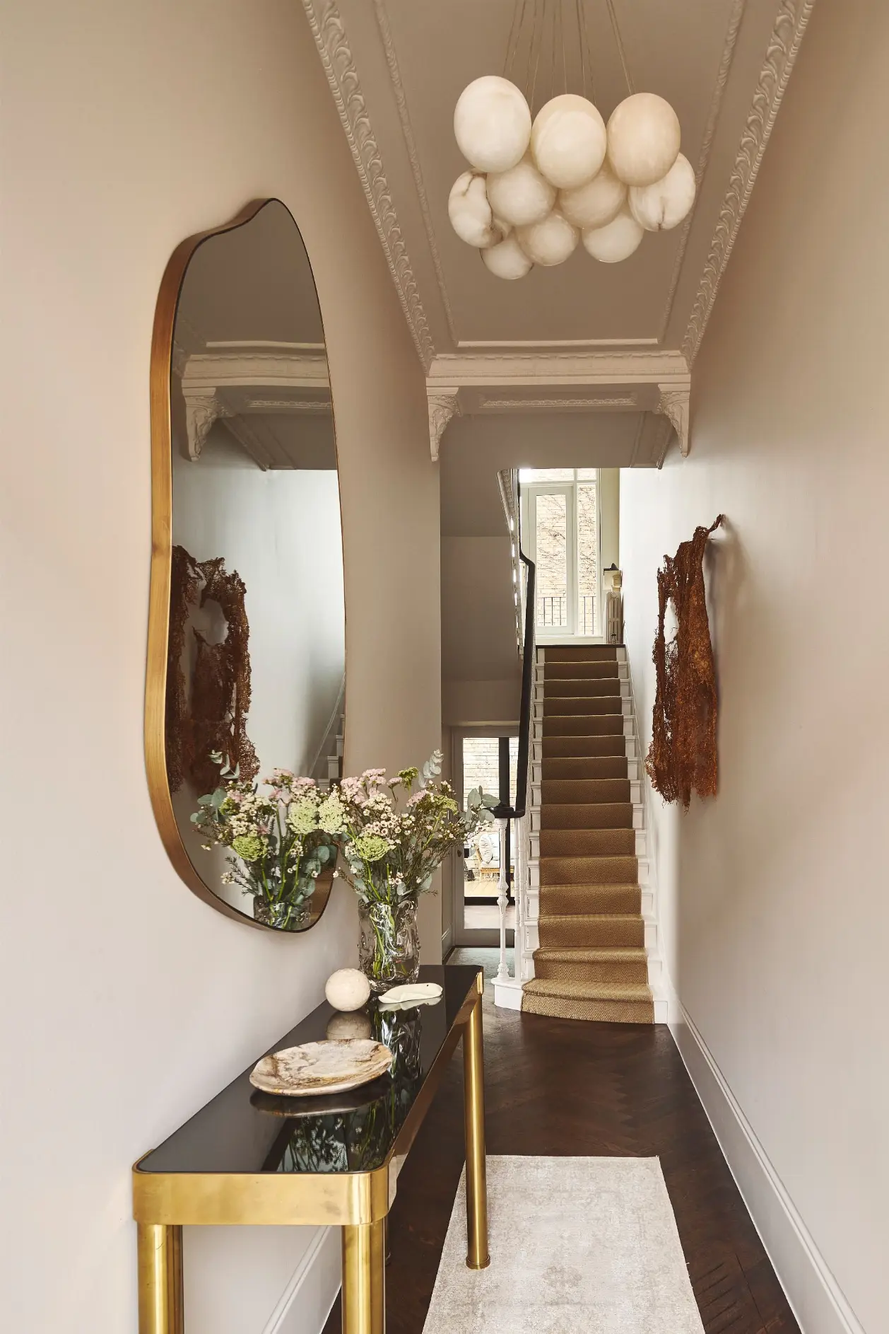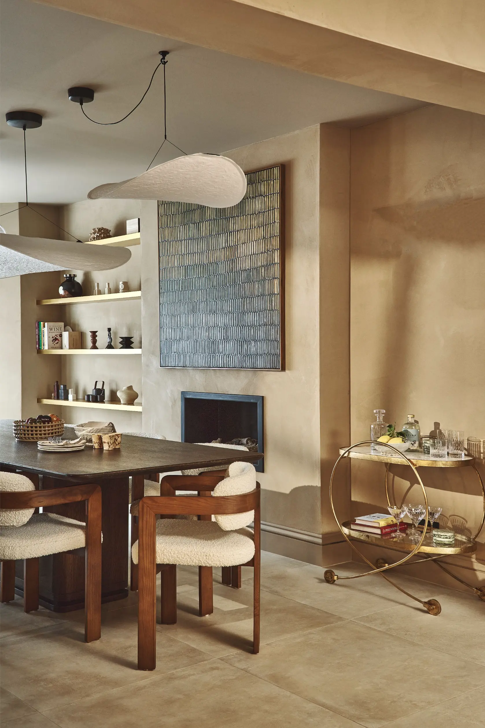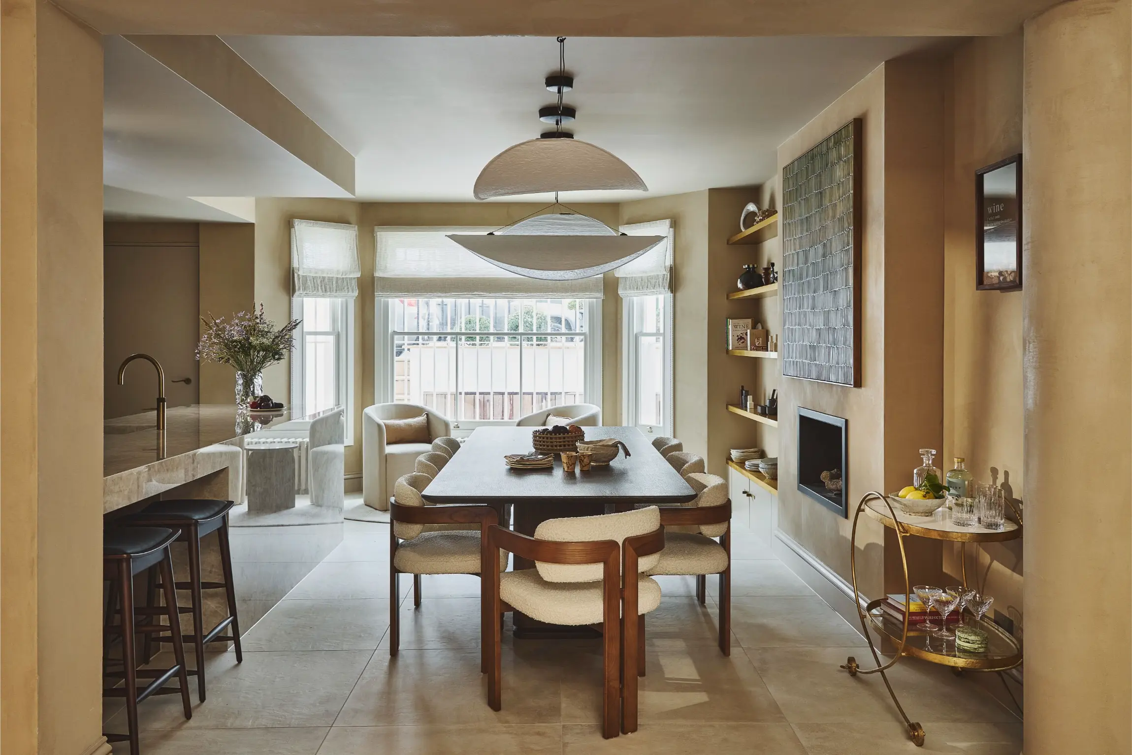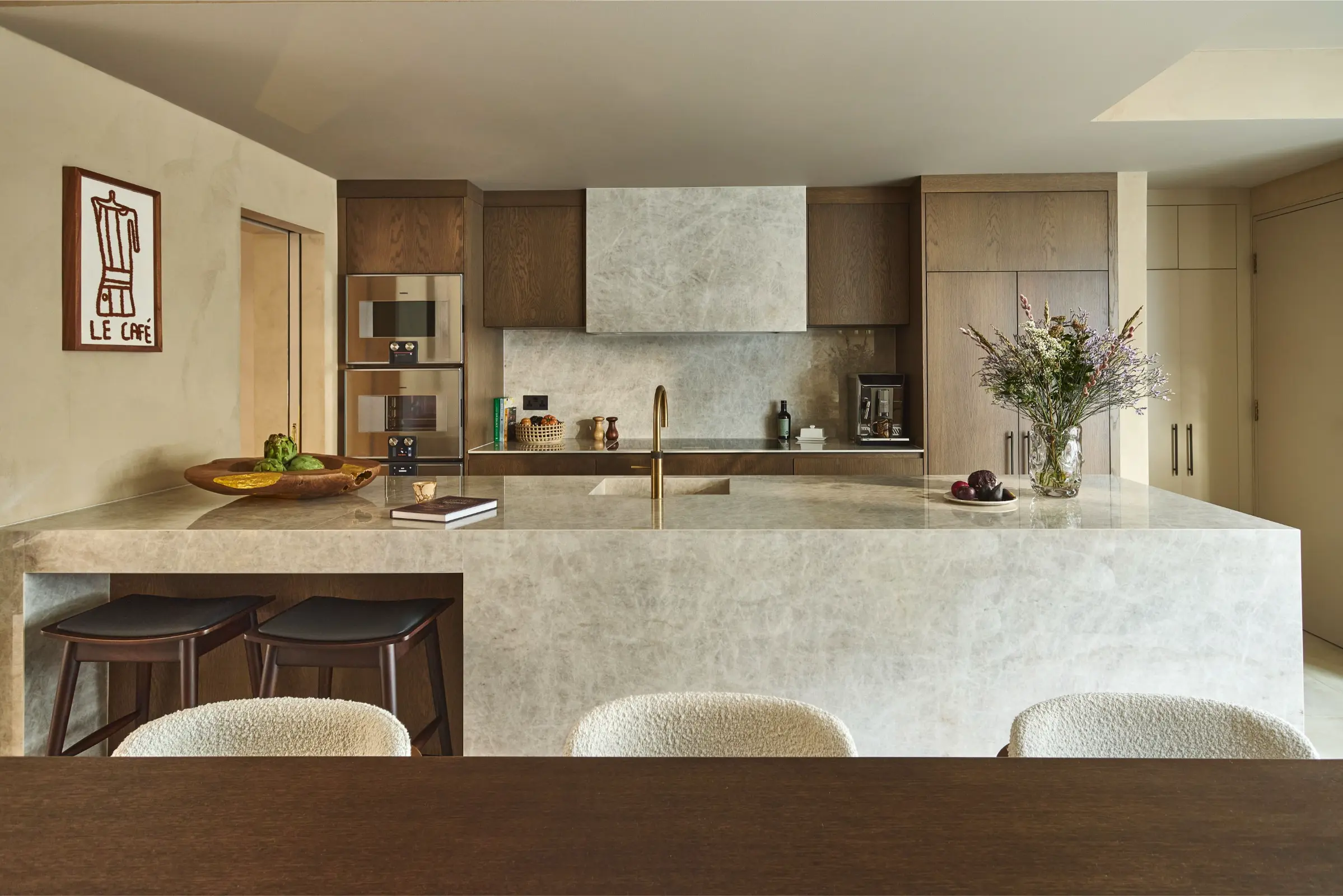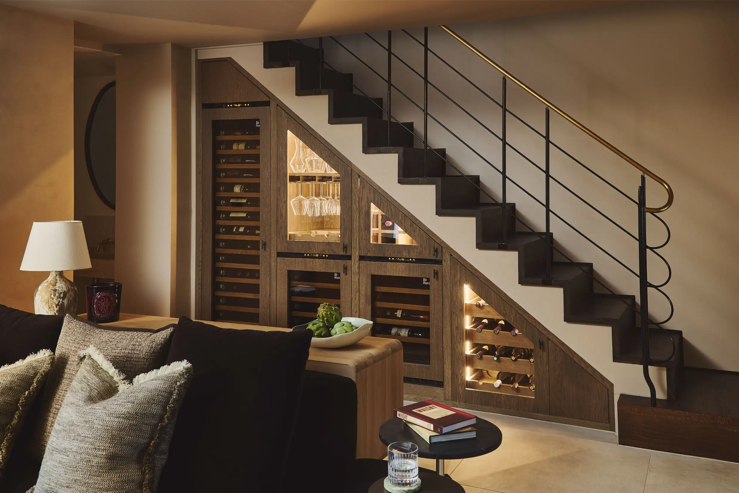 On the ground floor, the home has been reshaped to support both day-to-day living and entertaining. An earthy toned kitchen by Cor Domi sits alongside an expansive dining setting for hosting, while bespoke wine storage and integrated refrigeration are cleverly built into the staircase, transforming an awkward space into a striking and highly functional feature. In the formal reception room, existing joinery was mirrored and refined to create balance and provide a gallery like setting for art and objects collected during the client’s travels.