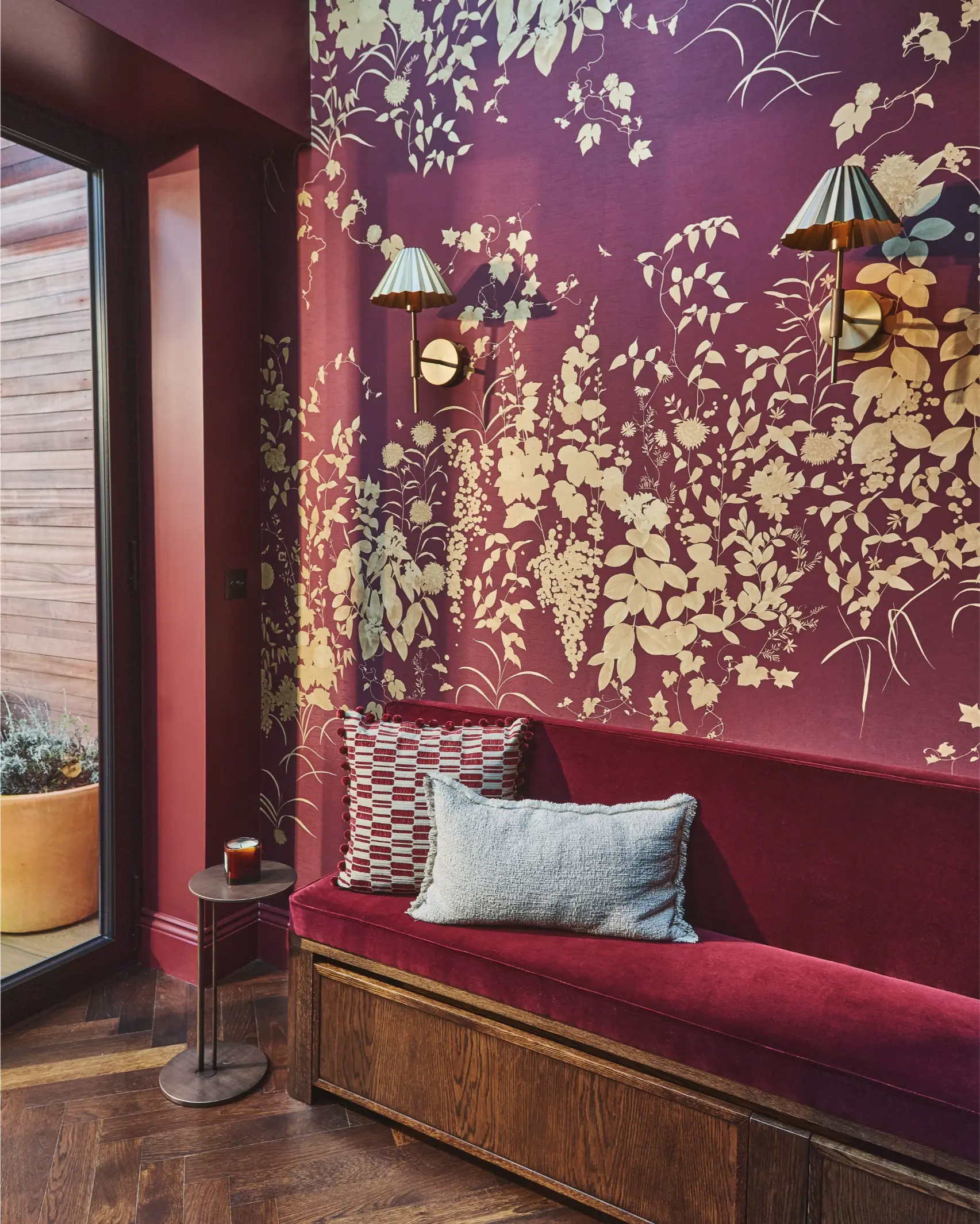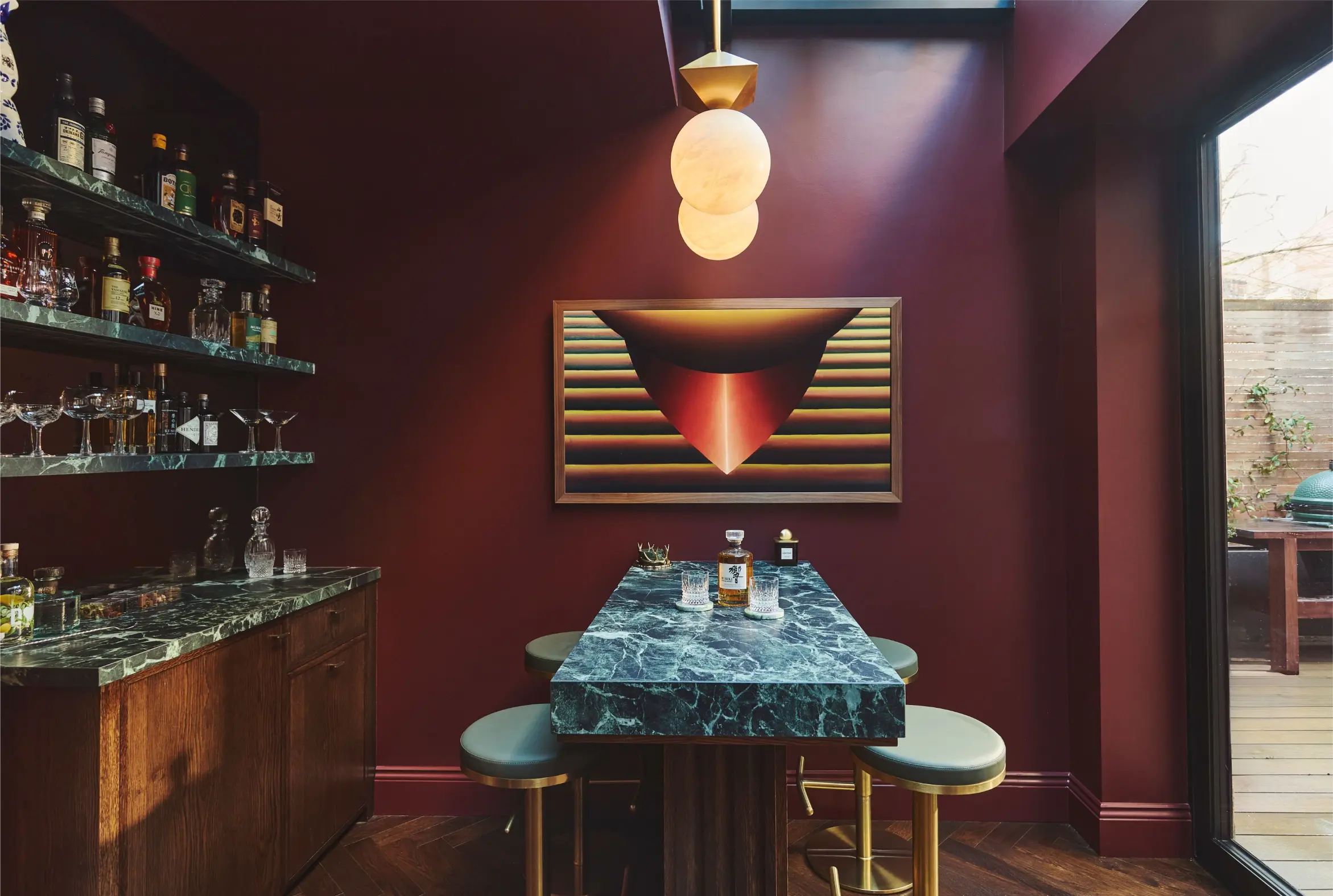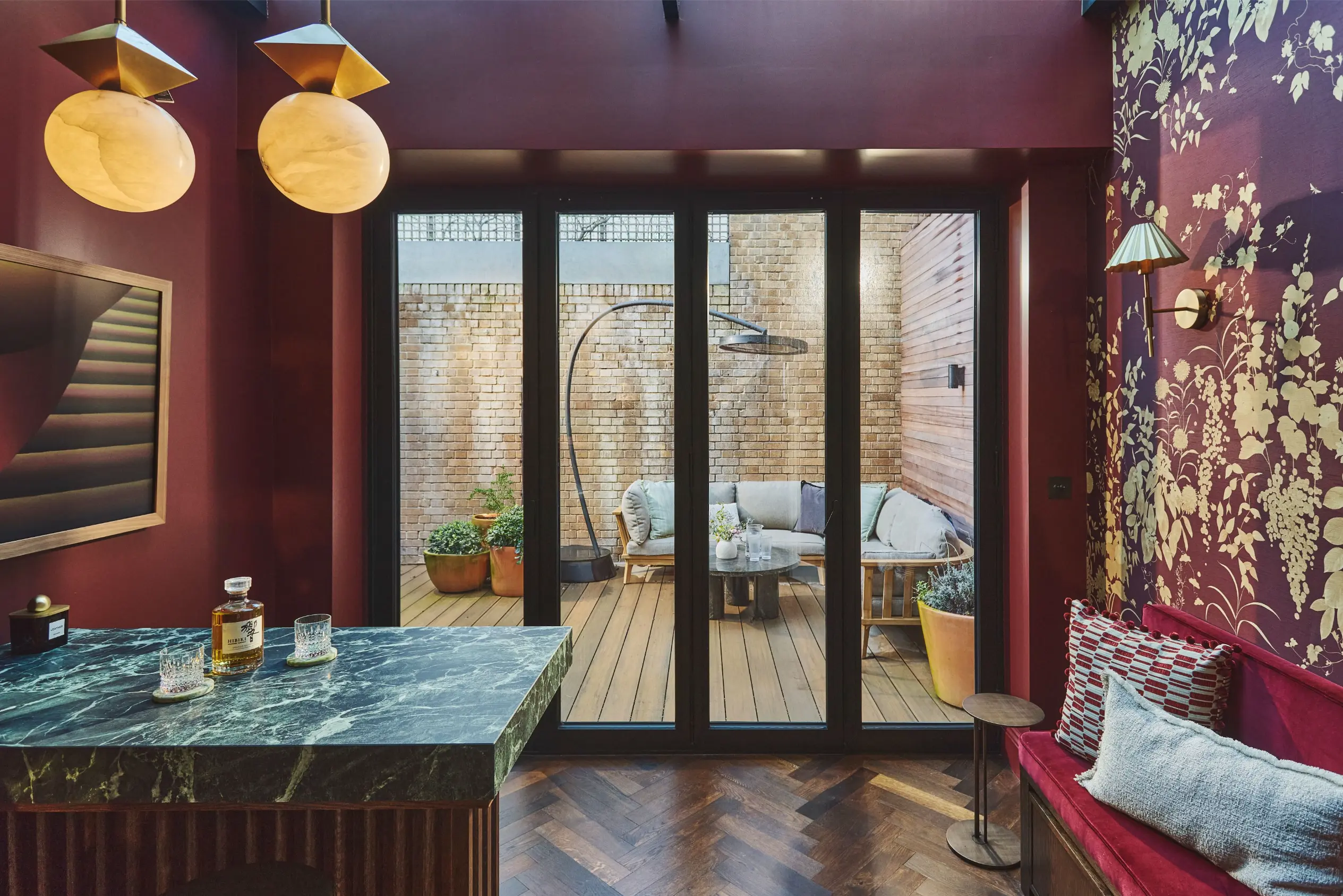 A former study has been transformed into a richly coloured bar with built in seating, opening onto an extended terrace via bifold doors.