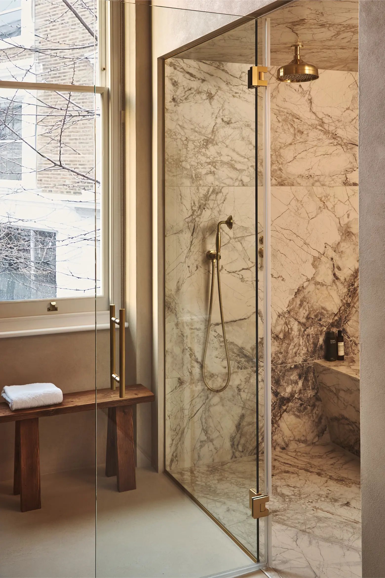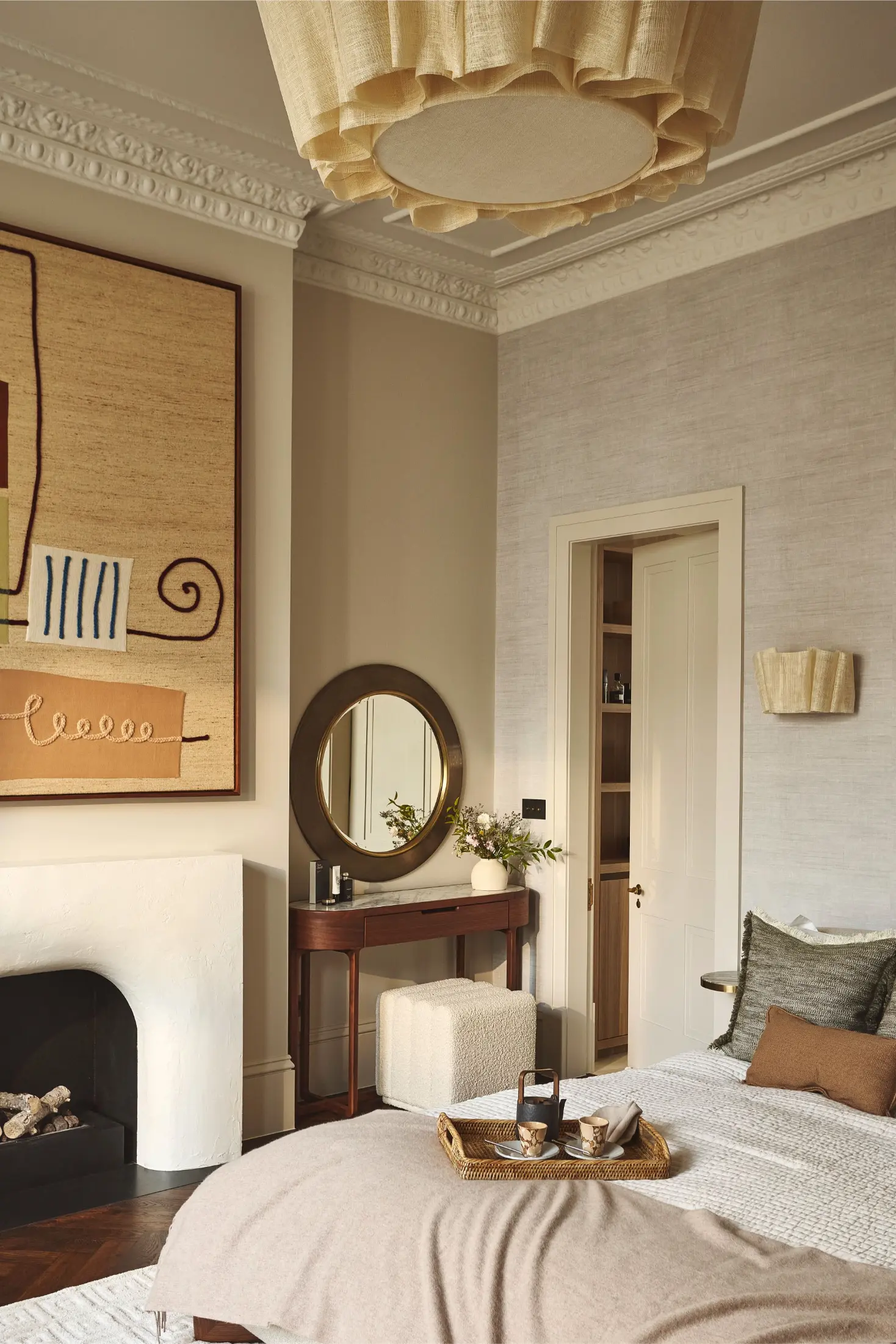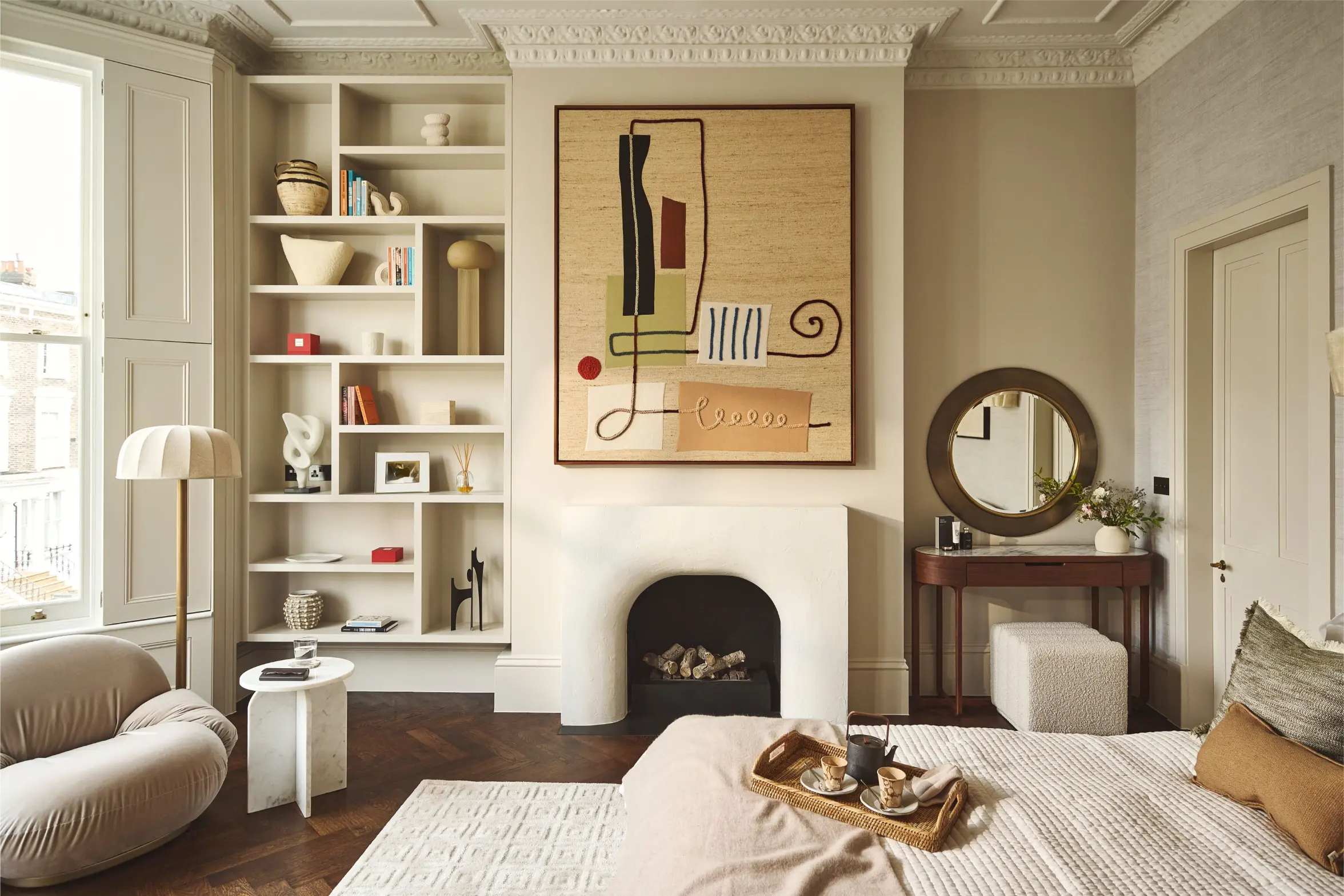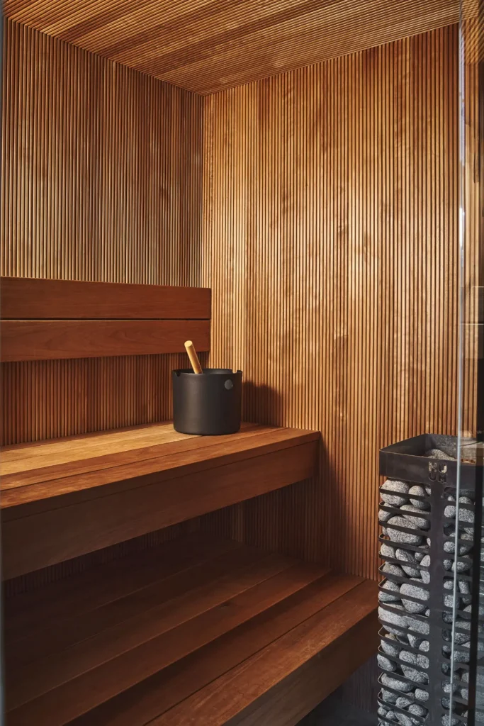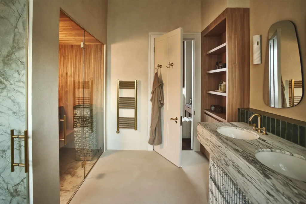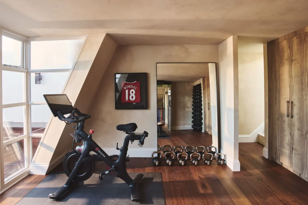 Wellness was another defining part of the brief. In the principal suite, a steam shower and microcement clad sauna have been integrated into the ensuite to create a spa-like retreat within the home. At roof level, a bespoke gym with views across Notting Hill adds another layer of everyday functionality and has been designed with future flexibility in mind, allowing the space to adapt as the client’s needs evolve. Throughout the house, natural finishes including limewash and clay plaster introduce softness, depth and tactility, reinforcing the serene atmosphere that underpins the entire project.